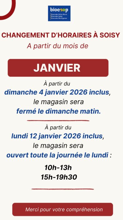 Le magasin de Soisy-sur-Seine sera fermé le dimanche matin à partir du dimanche 4 janvier 2026 inclus.