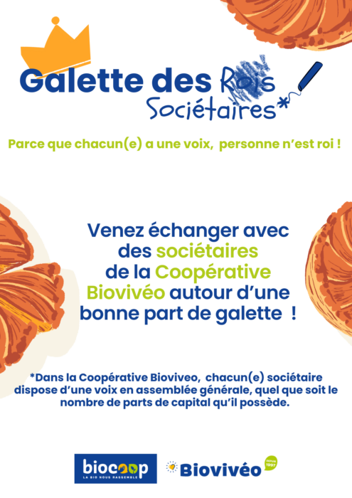 Parce que chacun a une voix et que personne n’est roi,les magasins Biocoop Biovivéo vous invitent à leurs galettes des sociétaires.